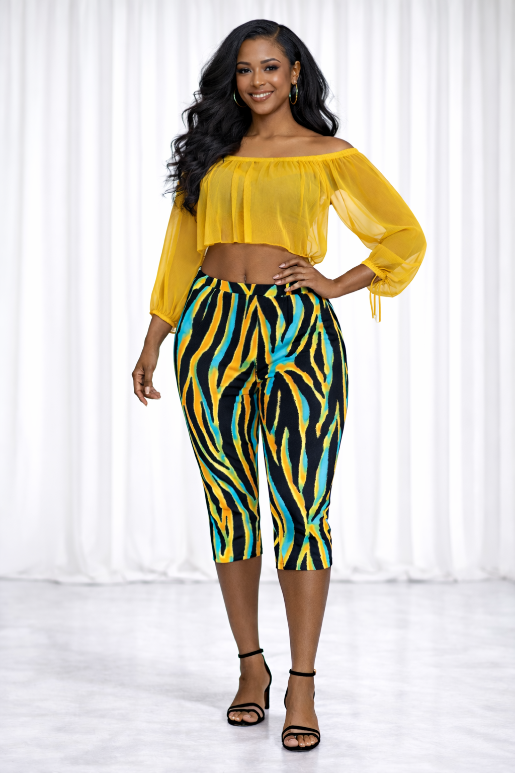 Step into bold, playful elegance with the Golden Hour Sheer Capri Set. This eye-catching two-piece features high-waisted capris designed to sculpt and flatter, finished in a vibrant multicolor abstract print that instantly commands attention. The sheer off-the-shoulder top adds soft drama with its airy silhouette and flirt sleeves that gather delicately at the wrists for a romantic, feminine touch.